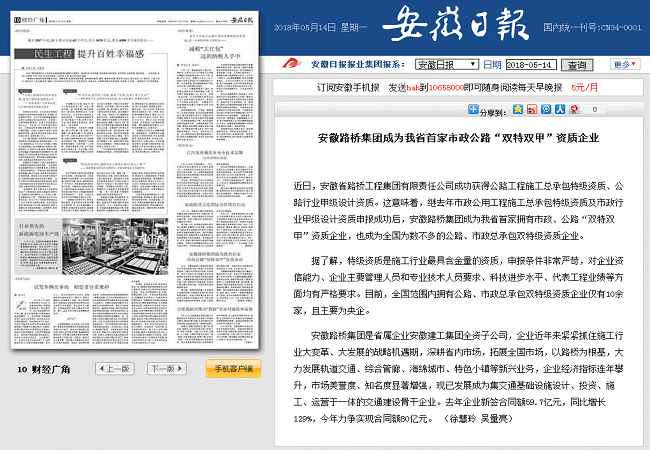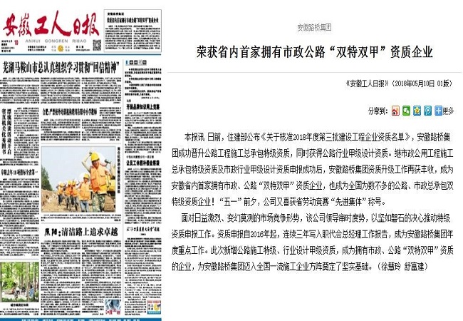 5月14日,安徽日報第十版的財經(jīng)廣角版塊也較長篇幅的報道了公司成功申報“雙特雙甲”資質(zhì),安徽日報客戶端同步進(jìn)行報道。此外,安徽工人日報也對此進(jìn)行了重點報道。