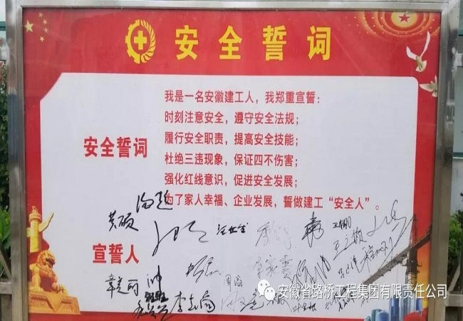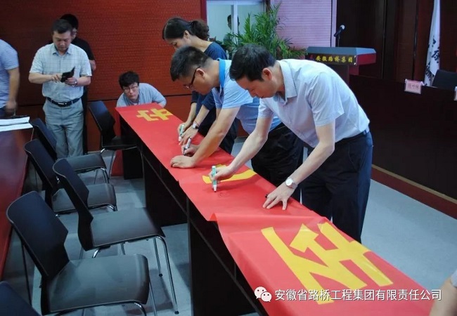全體參會人員在印有本次安全生產(chǎn)月主題“生命至上、安全發(fā)展”的條幅上進(jìn)行簽字