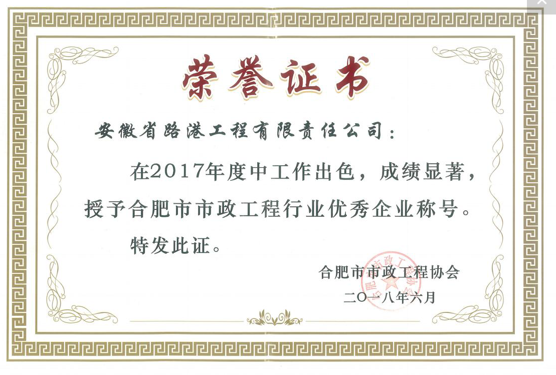 近日,安徽路港公司被合肥市市政工程協(xié)會(huì)授予“2017年度合肥市市政工程行業(yè)優(yōu)秀企業(yè)”榮譽(yù)稱號(hào),邢磊、張幫偉兩位同志被授予“合肥市市政工程行業(yè)優(yōu)秀項(xiàng)目經(jīng)理”榮譽(yù)稱號(hào)。