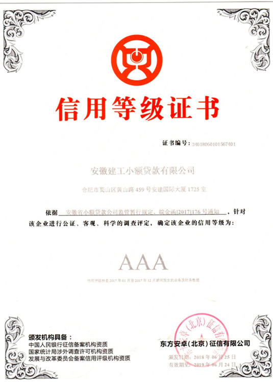 繼2017年安徽建工小額貸款有限公司(以下簡稱安建小貸)首次榮獲行業(yè)最高“AAA”等級信用證書之后,安建小貸全體員工再接再厲、共謀發(fā)展,于2018年6月,再次榮獲行業(yè)最高“AAA”等級信用證書。這是充分體現(xiàn)了省、市、區(qū)各級金融監(jiān)管部門對安建小貸經(jīng)營管理、風(fēng)險控制、業(yè)務(wù)模式等各項基礎(chǔ)工作的認(rèn)可,也是對安建小貸從事集團(tuán)內(nèi)部供應(yīng)鏈業(yè)務(wù)的高度肯定。按照相關(guān)制度規(guī)定,“AAA”資質(zhì)將有助于安建小貸增加經(jīng)營范圍,形成靈活多樣的產(chǎn)品品種,滿足客戶不同需求;有助于拓寬融資渠道,提高杠桿水平,以及有助于公司在政商環(huán)境中的認(rèn)可度等。