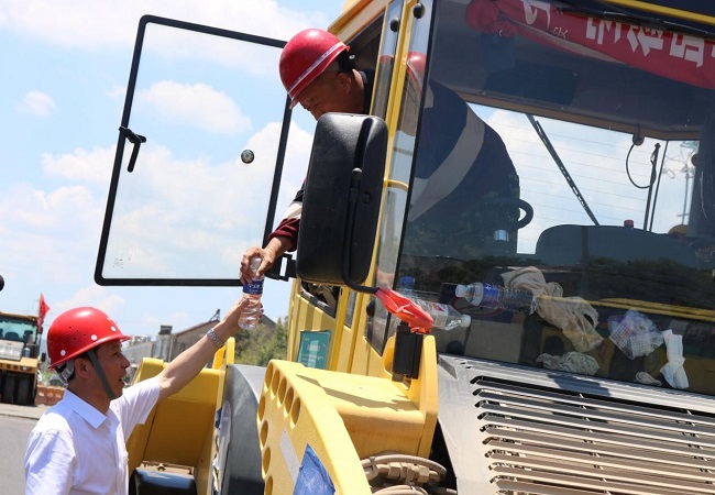 公司領導每到一處,都會先來到溫度最高,熱浪最強的一線施工現場,雖然烈日當空,但在作業(yè)現場都會看到安徽路橋集團的紅旗招展,施工一線機械轟鳴,一片大干繁忙的景象,領導們每到一處,最先關心的就是一線施工人員,向他們表示親切的問候,并親手將防暑降溫慰問品以及防暑降溫藥品送到一線職工手中,叮囑項目管理人員要合理安排員工作息時間,采取有效防暑降溫措施,保證高溫作業(yè)條件下員工的身體健康。