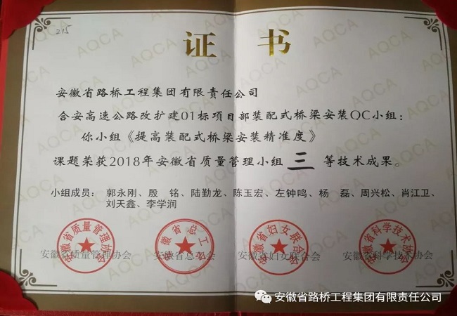 由公司選送的《提高裝配式橋梁安裝精準(zhǔn)度》 QC小組課題榮獲2018年安徽省質(zhì)量管理小組三等技術(shù)成果。裝配式橋梁尚屬于公路橋梁施工研究階段,此次QC小組活動成功解決墩柱安裝存在的主要問題,為后續(xù)裝配式橋梁施工提供了良好的施工經(jīng)驗,贏得了業(yè)主和監(jiān)理單位的好評,提升了企業(yè)形象,取得了良好的社會效益。