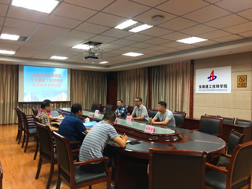 2018年8月17日上午,安徽建工技師學(xué)院與六安技師學(xué)院成教聯(lián)合辦學(xué)協(xié)議簽字儀式在安徽建工技師學(xué)院行政樓三樓會議室舉行。六安技師學(xué)院副院長姚運林、教務(wù)處長李珍紅、成教辦主任任海鑫,安徽建工技師學(xué)院副院長任建設(shè)、招生就業(yè)處處長吳成群等共同出席簽約儀式。簽約儀式由任建設(shè)主持。