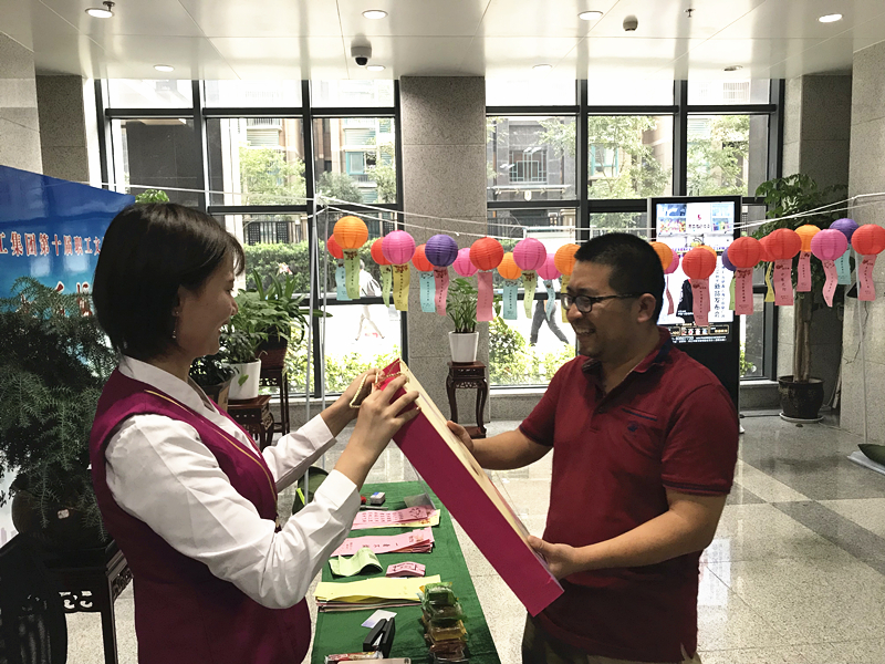 活動當天,物業(yè)管理處工作人員積極準備,安建大廈南大廳展架上懸掛100多條燈謎,處處洋溢著濃濃的文化氛圍。謎面科學而通俗,猜字的、成語的、人名的、地方特色的應有盡有,在益智添趣的同時,讓駐廈單位員工領略漢語奧妙,娛樂生活?;顒蝇F(xiàn)場,絡繹不絕的駐廈員工踴躍參與其中,積極思考,盡展睿智,數(shù)十余人猜中謎語贏得月餅獎勵,將現(xiàn)場氛圍不斷推向高潮。