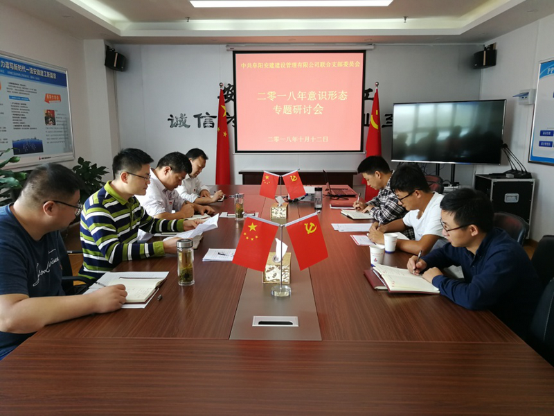 10月12日上午,安建投資阜陽安建建設(shè)管理有限公司聯(lián)合黨支部召開2018年意識(shí)形態(tài)專題研討會(huì)。會(huì)議對(duì)上一階段意識(shí)形態(tài)工作進(jìn)行了全面總結(jié),并對(duì)下一階段工作進(jìn)行了安排部署。聯(lián)合支部書記蔡方紅主持會(huì)議,支部支委班子成員參加會(huì)議并就多個(gè)問題展開熱烈討論。