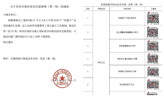 四是發(fā)布《可視化技術(shù)交底視頻(第一批)》和《首件兩會制》樣板,提升工程標準化建設(shè)水平。總工辦整理發(fā)布部分施工工藝視頻,項目部通過掃描二維碼等方式下載獲取,供可視化技術(shù)交底使用。總工辦聯(lián)合一分公司、S332 安慶至望江項目梳理“首件兩會制”實施流程,并編制相關(guān)范本,切實發(fā)揮其指導(dǎo)作用和示范效應(yīng),提高工程施工質(zhì)量。