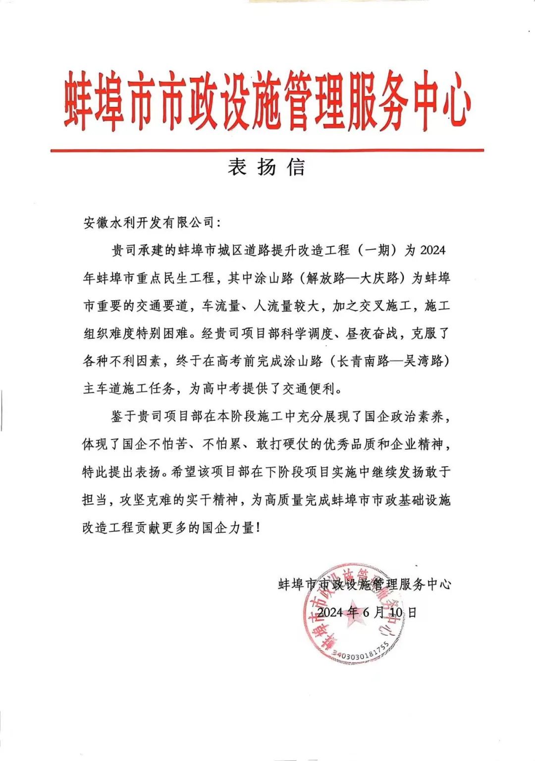 近日,安徽水利蚌埠市城區(qū)道路提升改造工程(一期)項(xiàng)目收獲政府表?yè)P(yáng)信,對(duì)項(xiàng)目團(tuán)隊(duì)在建設(shè)過(guò)程中付出的努力和取得的成績(jī)表示肯定。