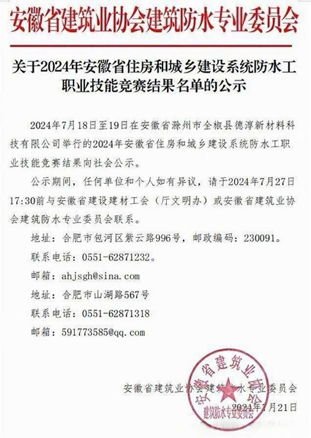 7月19日上午,2024年安徽省住房和城鄉(xiāng)建設(shè)系統(tǒng)防水工職業(yè)技能競(jìng)賽暨第一屆全國(guó)住房城鄉(xiāng)建設(shè)行業(yè)職業(yè)技能大賽、全國(guó)建筑防水行業(yè)職業(yè)技能競(jìng)賽安徽省選拔賽在全椒順利舉辦。建工建投集團(tuán)員工黃吉發(fā)參加比賽并榮獲“SBS改性瀝青防水卷材類(lèi)”個(gè)人一等獎(jiǎng),建工建投集團(tuán)也被授予團(tuán)體一等獎(jiǎng)!