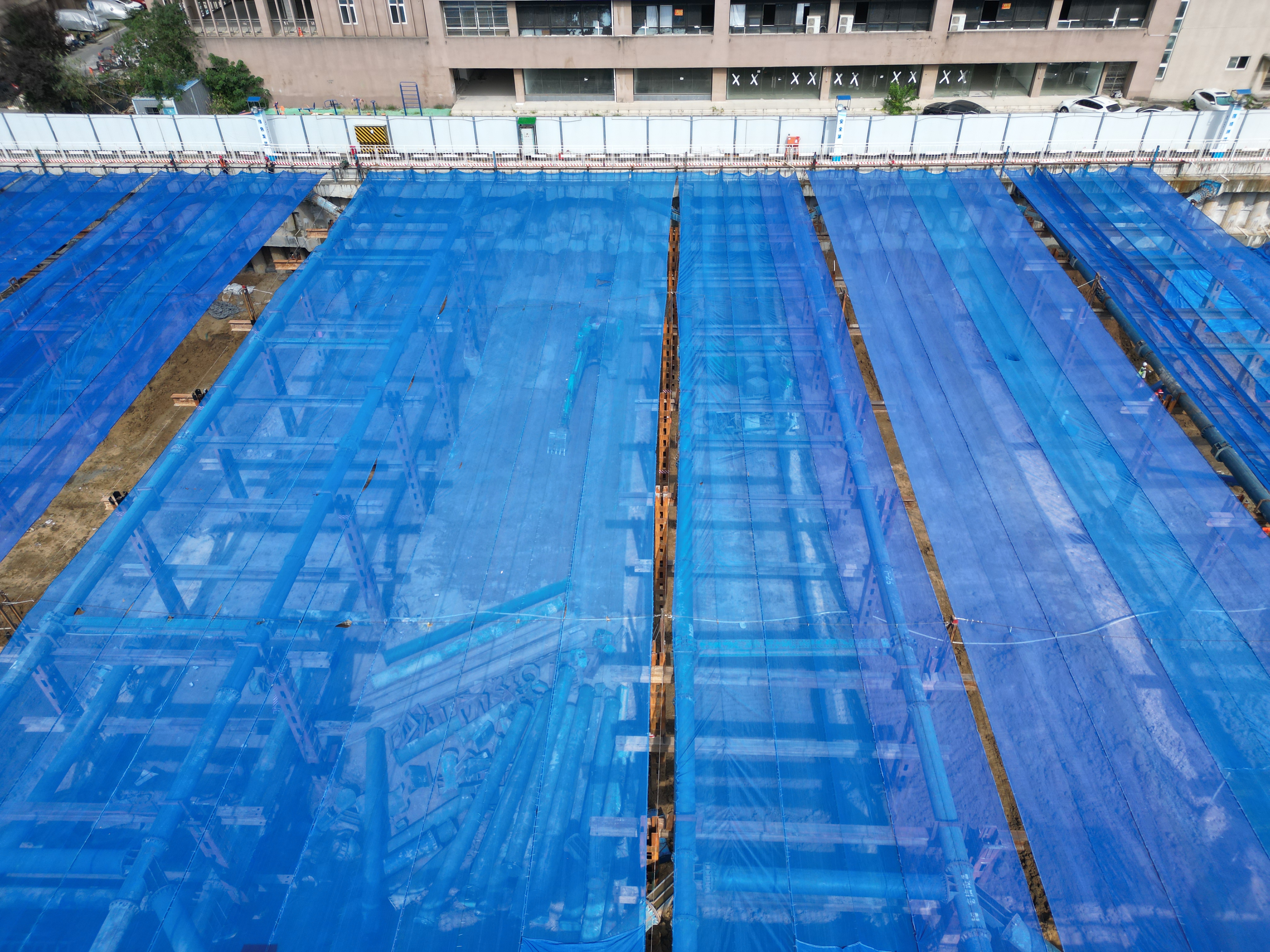 該項(xiàng)目距離市二院住院部及居民區(qū)較近,為減小對(duì)人居環(huán)境的影響,啟用“天幕系統(tǒng)”是貫徹落實(shí)高質(zhì)量發(fā)展、探索綠色低碳發(fā)展的切實(shí)舉措。與傳統(tǒng)的施工作業(yè)相比,防塵天幕能夠減少80%以上的揚(yáng)塵,實(shí)現(xiàn)6520平方米的基坑全覆蓋。在土方開挖和錨噴作業(yè)過程中,啟用基坑防塵天幕系統(tǒng)的同時(shí)與噴淋系統(tǒng)結(jié)合使用,通過“天幕”系統(tǒng)將“露天作業(yè)”變?yōu)椤笆覂?nèi)作業(yè)”,實(shí)現(xiàn)整個(gè)基坑施工場(chǎng)地“綠色封閉式”管理。