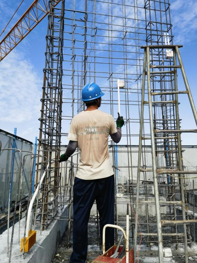 已經(jīng)被汗水浸濕衣服的小伙是水電工王雙軍,他正在密密麻麻的墻柱鋼筋中布置線管。