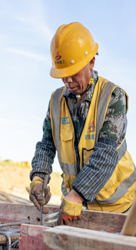 暴曬下的鋼筋表面十分燙手,站在邊上都能感覺到熱度。來自六安的程振合和李中俊作為鋼筋工能手正頭頂烈日,在鋼筋叢林中“穿針引線”。李中俊一手固定住鋼筋,一手熟練地用工具把鋼筋綁扎好。這樣的動作,他每天都要重復(fù)無數(shù)次。