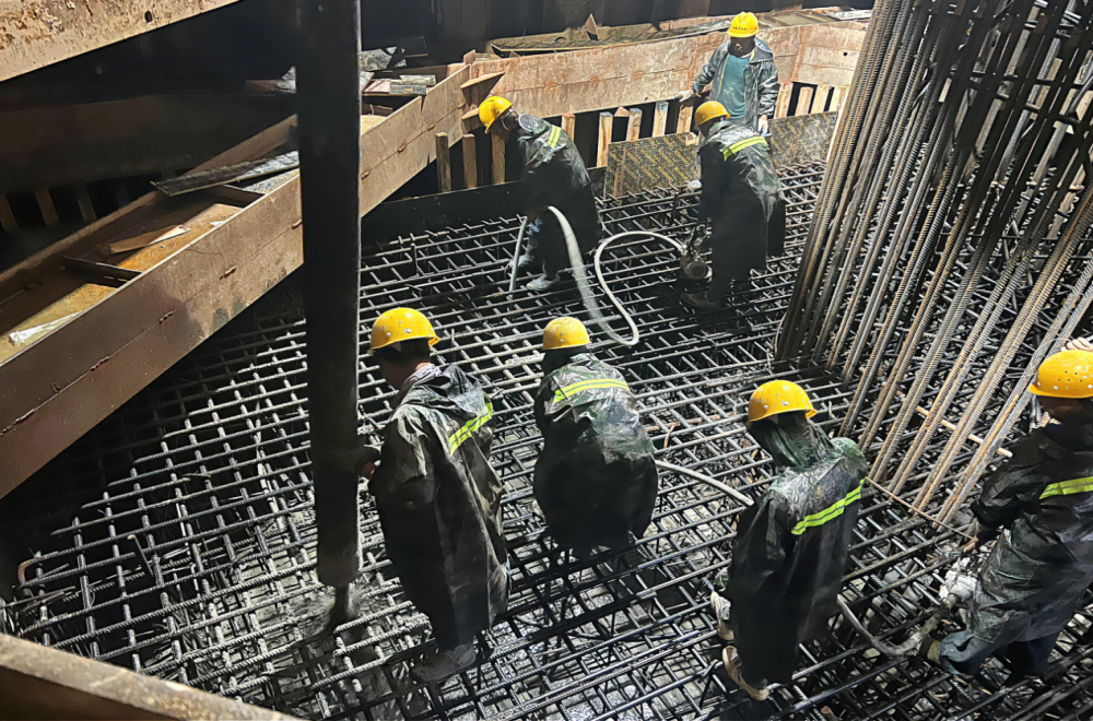 持續(xù)的陰雨天氣導(dǎo)致渦河圍堰底部潮濕寒冷、河水水位上漲、施工難度增大,項目一線人員輪班堅守、攻堅克難,確保澆筑順利進(jìn)行。