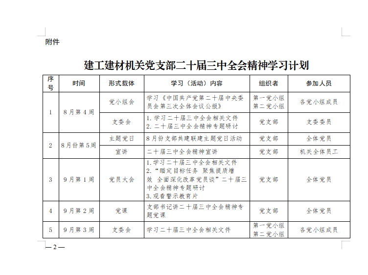 全面系統(tǒng)學(xué)。根據(jù)上級(jí)黨委要求,結(jié)合支部實(shí)際,精心制定《建工建材機(jī)關(guān)黨支部二十屆三中全會(huì)精神學(xué)習(xí)計(jì)劃》,堅(jiān)持“周周有動(dòng)作”原則,借助“三會(huì)一課”“主題黨日”等學(xué)習(xí)載體,有序推進(jìn)全會(huì)精神學(xué)習(xí)走深走實(shí)。