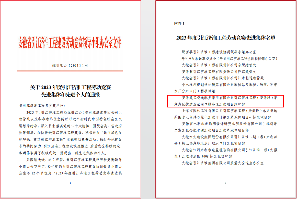 近日,水建分公司引江濟淮工程(安徽段)巢湖湖區(qū)航道及派河口服務區(qū)工程項目經(jīng)理部榮獲2023年度引江濟淮工程先進集體。