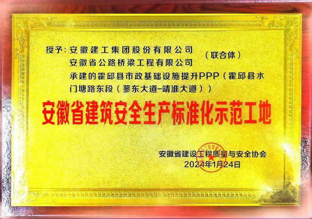 近日,建工投資霍邱PPP項(xiàng)目水門塘路東段(蓼東大道-靖淮大道)工程被安徽省建設(shè)工程質(zhì)量與安全協(xié)會(huì)授予“安徽省建筑安全生產(chǎn)標(biāo)準(zhǔn)化示范工地”榮譽(yù)稱號。