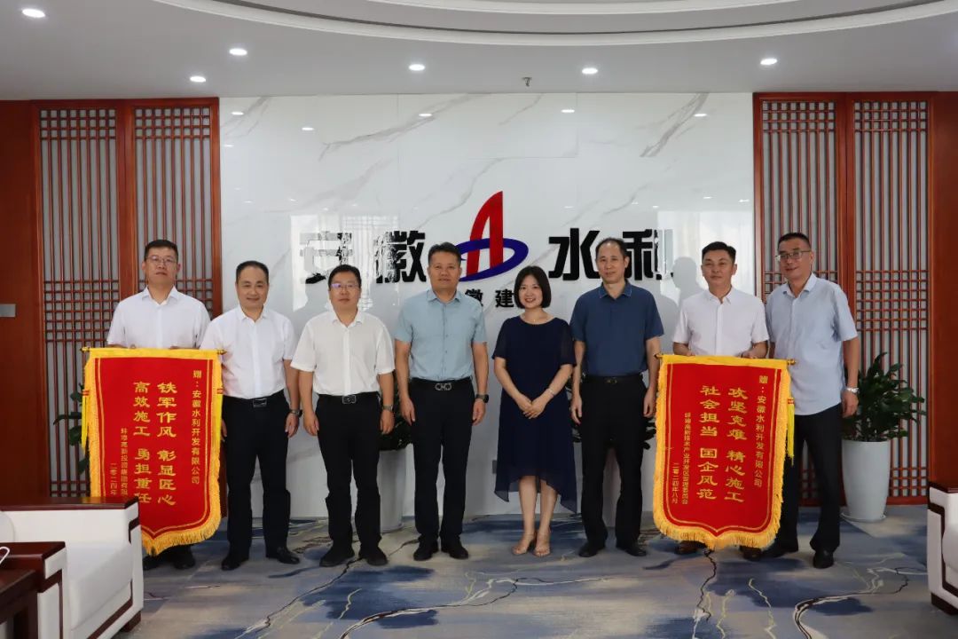9月5日,蚌埠市高新區(qū)社會事業(yè)局黨委書記、局長錢玉,蚌埠高新投資集團有限公司黨委書記、董事長李德旺,副總經(jīng)理陳輝一行來到安徽水利,將兩面錦旗送到建工股份副總經(jīng)理、安徽水利黨委書記、董事長張鍵手中,并就進一步深化合作開展會談交流。