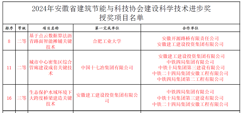 近日,2024年建設(shè)科學(xué)技術(shù)進(jìn)步獎結(jié)果公布,建工建投3項成果脫穎而出,其中“基于點云數(shù)據(jù)算法瀝青路面智能攤鋪關(guān)鍵技術(shù)”和“城市中心密集區(qū)綜合管廊建設(shè)成套關(guān)鍵技術(shù)”2項成果獲二等獎,“生態(tài)保護(hù)水域環(huán)境下大跨度橋梁建造關(guān)鍵技術(shù)”成果獲三等獎。