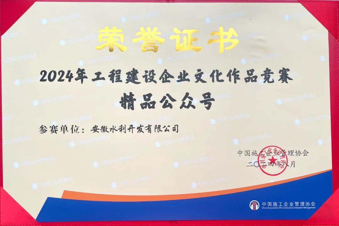 9月4日至6日,中國施工企業(yè)管理協(xié)會在南京召開2024年工程建設(shè)企業(yè)文化建設(shè)成果交流會,安徽水利在公眾號、網(wǎng)站、企業(yè)文化案例、微視頻、書法多個類別中,共入圍7項作品,2人獲評企業(yè)文化專家,1人獲評優(yōu)秀通訊員。