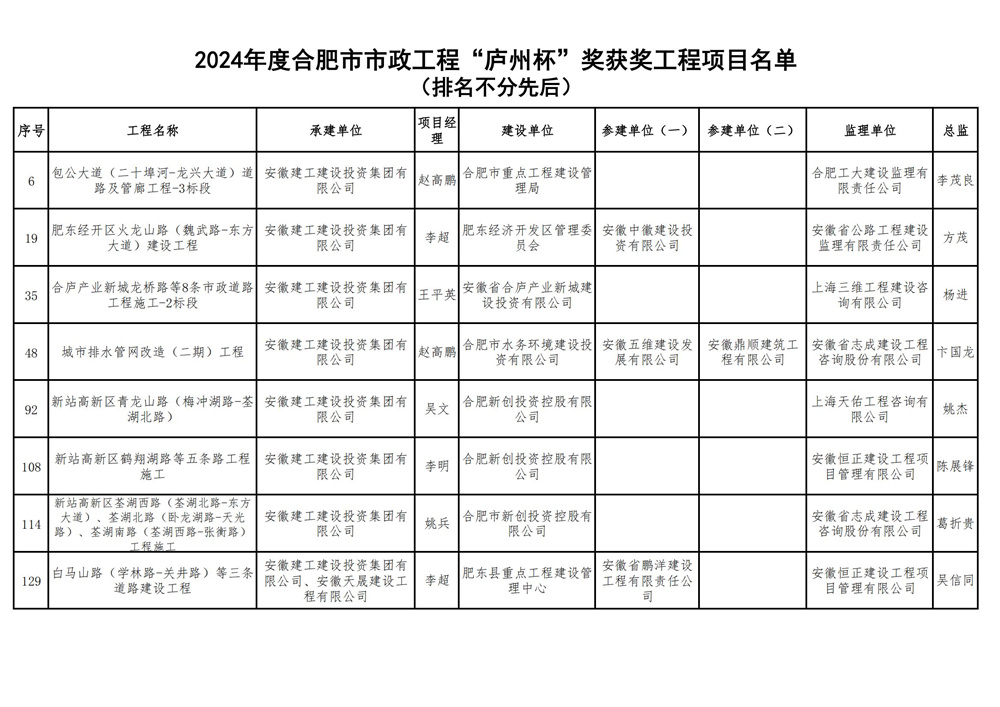 “廬州杯”獎(jiǎng)是合肥市市政工程質(zhì)量的最高獎(jiǎng)項(xiàng)(市優(yōu)質(zhì)工程)。獲獎(jiǎng)工程均為建設(shè)規(guī)范、設(shè)計(jì)施工先進(jìn)、質(zhì)量優(yōu)良、運(yùn)行安全可靠的工程,且工程質(zhì)量達(dá)到市內(nèi)領(lǐng)先水平。本次獲獎(jiǎng)工程分別為:包公大道(二十埠河-龍興大道)道路及管廊工程-3標(biāo)段,肥東經(jīng)開區(qū)火龍山路(魏武路-東方大道)建設(shè)工程,合廬產(chǎn)業(yè)新城龍橋路等8條市政道路工程施工-2標(biāo)段,城市排水管網(wǎng)改造(二期)工程,新站高新區(qū)青龍山路(梅沖湖路-荃湖北路)工程,新站高新區(qū)鶴翔湖路等五條路工程,新站高新區(qū)荃湖西路(荃湖北路-東方大道)、荃湖北路(臥龍湖路-天光路)、荃湖南路(荃湖西路-張衡路)工程,白馬山路(學(xué)林路-關(guān)井路)等三條道路建設(shè)工程。