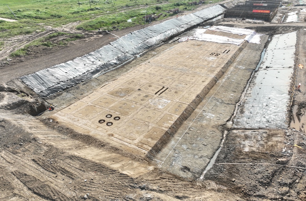 程營進洪閘地基處理的水泥土攪拌樁部分由三種樁型組成,分別為格柵樁,散樁以及防滲墻,樁徑均為600mm。本次驗收的第十六聯(lián)攪拌樁數(shù)量為982根(其中格柵樁633根,散樁203根,防滲墻146根),地基處理于2024年1月20日進場施工,6月17日完成水泥土攪拌樁施工,8月17日開始土方開挖,8月30日完成土方開挖。第十七聯(lián)攪拌樁數(shù)量為974根(其中格柵樁633根,散樁195根,防滲墻146根),地基處理于2023年12月9日進場施工,2024年1月18日完成水泥土攪拌樁施工,8月17日開始土方開挖,8月30日完成土方開挖。