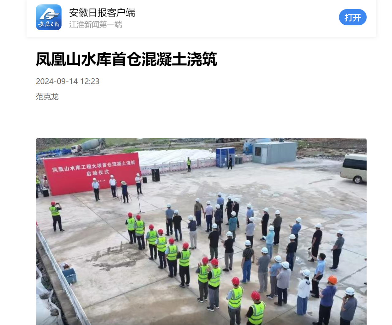 9月14日,安徽水利鳳凰山水庫大壩首倉混凝土正式啟動澆筑,項目全面進入主體結(jié)構(gòu)施工階段。廣德市委書記周其紅出席儀式并宣布澆筑啟動。 這一關(guān)鍵節(jié)點,受到了安徽日報、中青報、中新社、新安晚報、宣城日報等主流媒體關(guān)注報道。