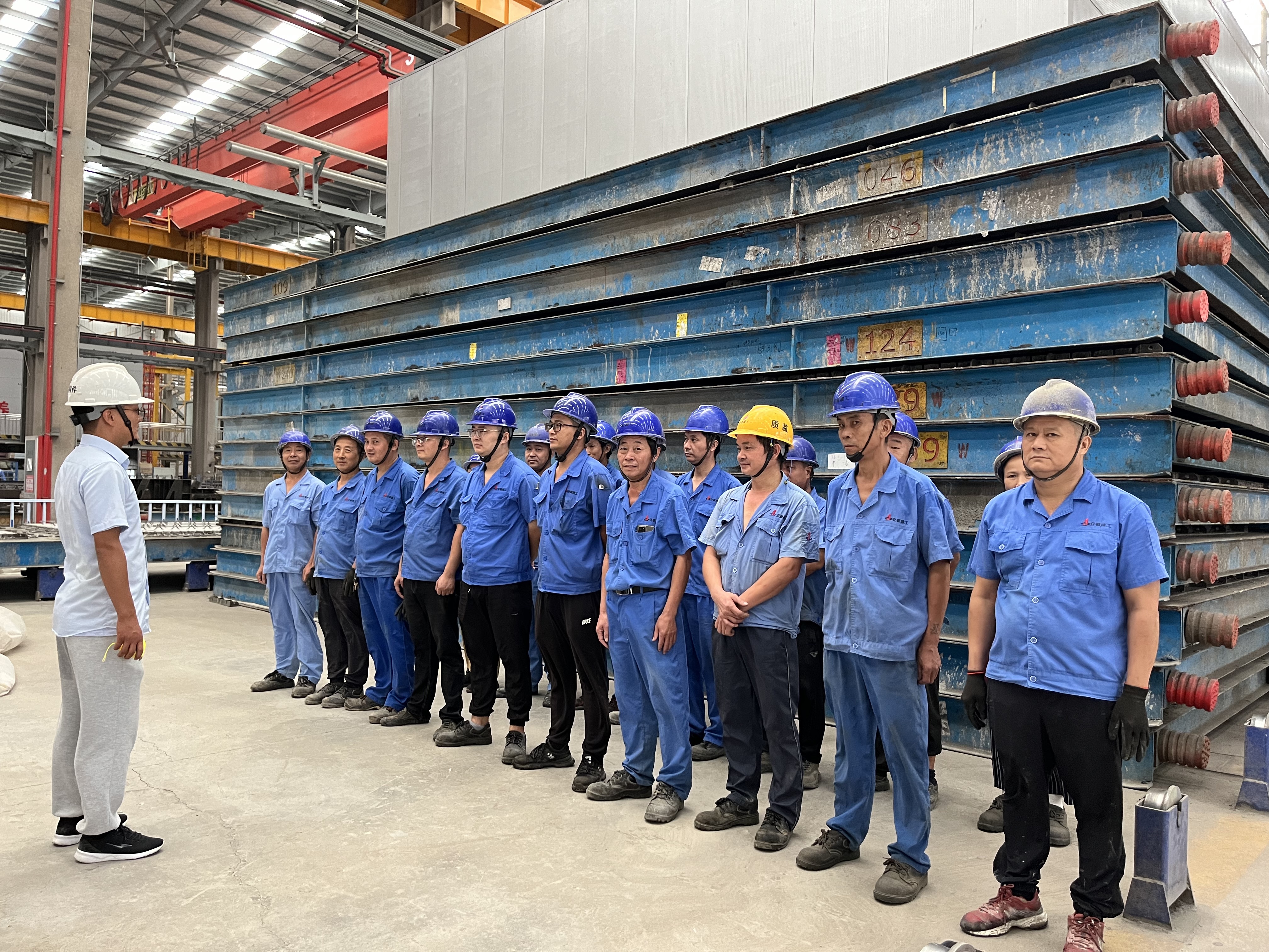 生產(chǎn)過程中,黨員充分發(fā)揮先鋒模范作用,全天候跟班作業(yè),全過程質(zhì)量把控,對預制梁柱的模具組裝校正、鋼筋籠安裝調(diào)整、預留預埋、混凝土澆筑振搗、拆模養(yǎng)護等工序嚴格把關(guān),及時調(diào)整優(yōu)化生產(chǎn)工藝。同時,管理團隊重視人才隊伍的培育,定期對關(guān)鍵崗位作業(yè)人員進行理論實操培訓,不斷強化生產(chǎn)技能,不斷提高生產(chǎn)效率。