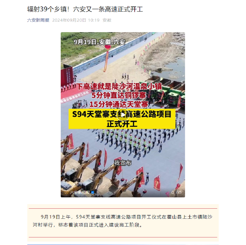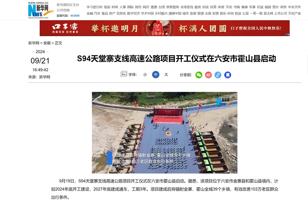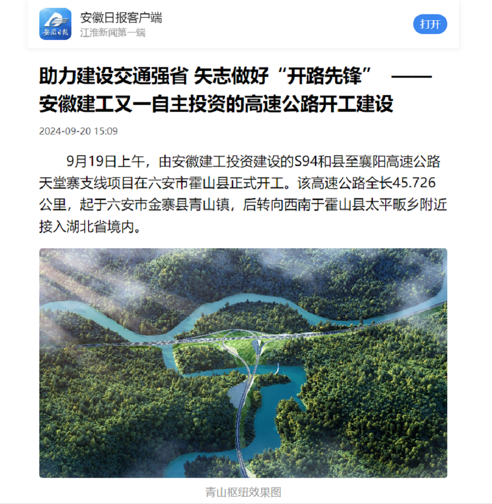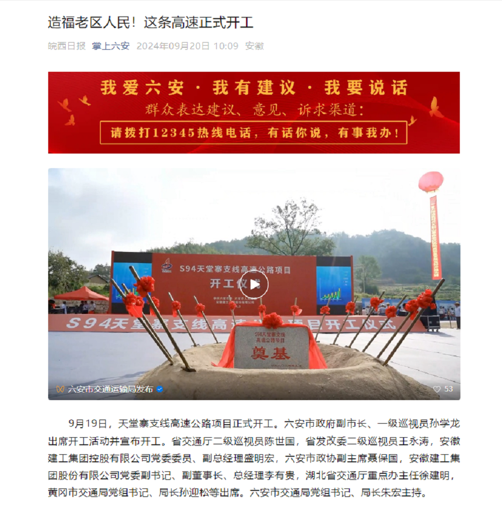 9月19日上午,由安徽建工投資建設(shè)的S94和縣至襄陽高速公路天堂寨支線項目在六安市霍山縣舉辦開工儀式,新華網(wǎng)、人民網(wǎng)、安徽日報、皖西日報等主流媒體紛紛聚焦項目開工。