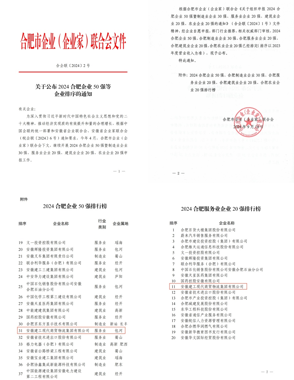 近日,合肥市企業(yè)(企業(yè)家)聯(lián)合會發(fā)布了2024合肥企業(yè)50強、合肥服務(wù)業(yè)企業(yè)20強榜單,建工商貿(mào)物流連續(xù)四年入選,分別位列第31位和第11位。