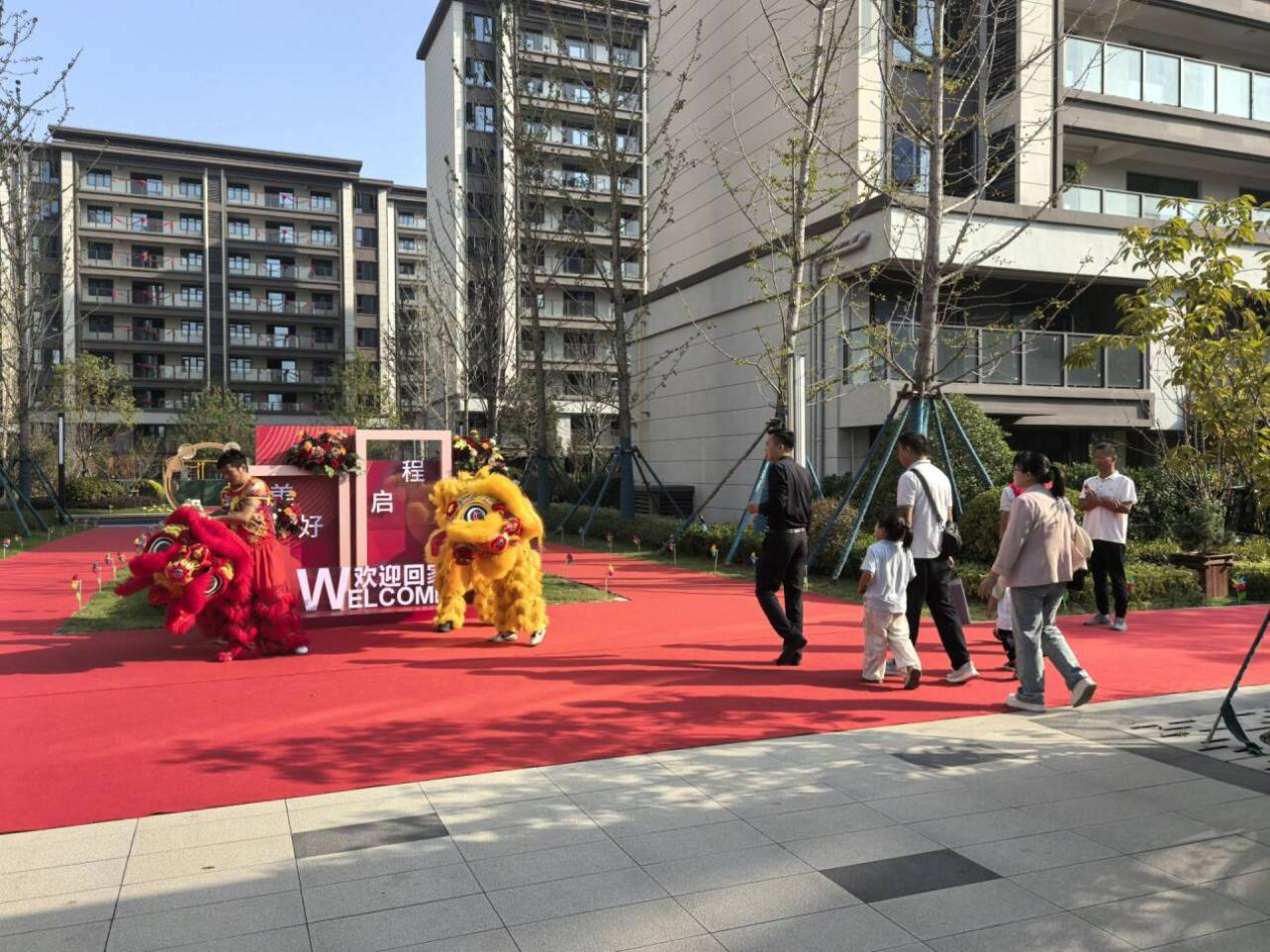 從踏入小區(qū)的那一刻起,業(yè)主們便享受到了全方位、細(xì)致入微的服務(wù)。交付現(xiàn)場(chǎng),繁花似錦,紅毯從入口一直延伸到交房大廳,引領(lǐng)著業(yè)主們步入夢(mèng)寐以求的新家。簽到審核迅速高效,手續(xù)辦理流程清晰,鑰匙移交儀式莊重而溫馨。項(xiàng)目還準(zhǔn)備了精彩的舞獅表演,每一個(gè)動(dòng)作都寓意著喜慶與吉祥,給足交房?jī)x式感。