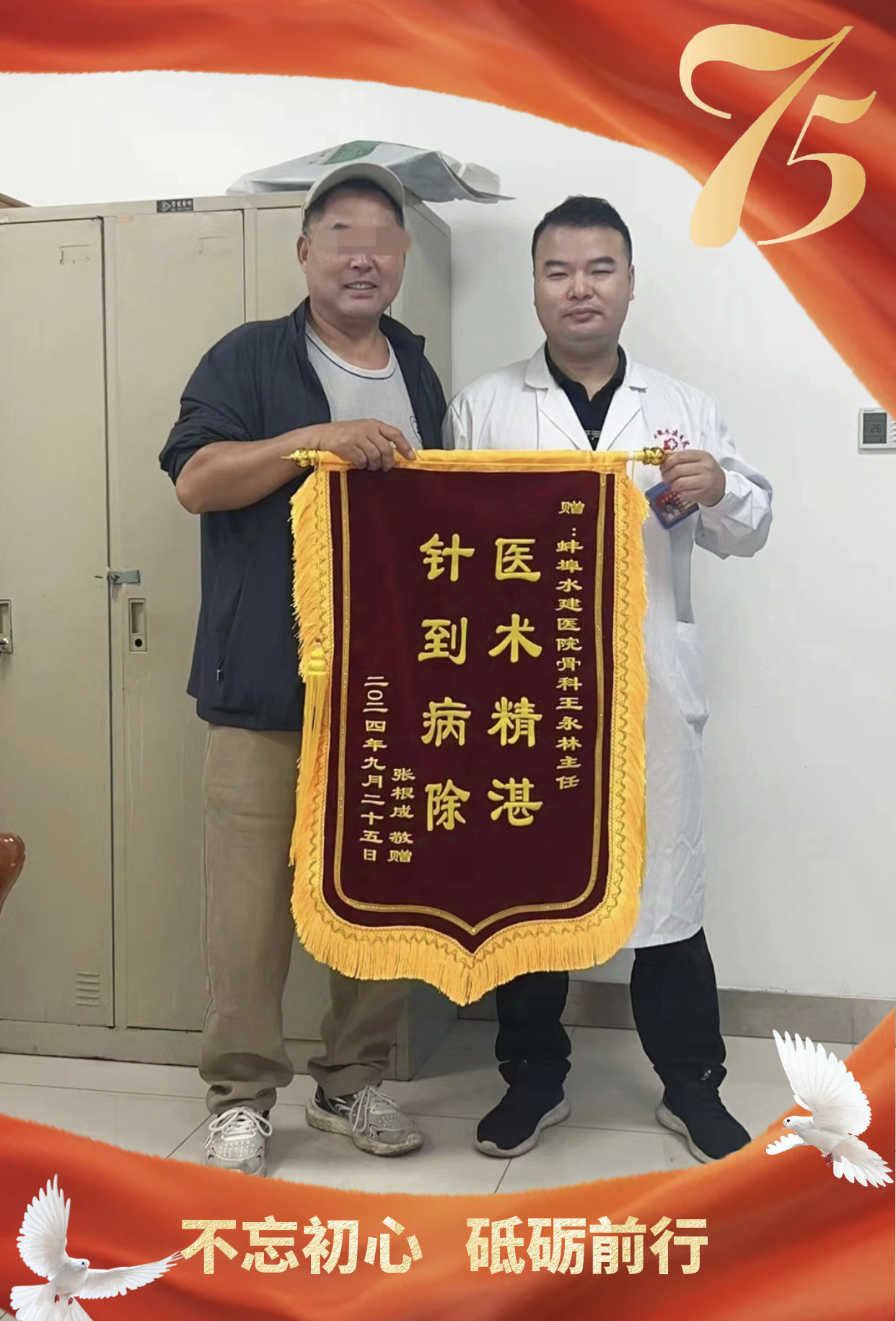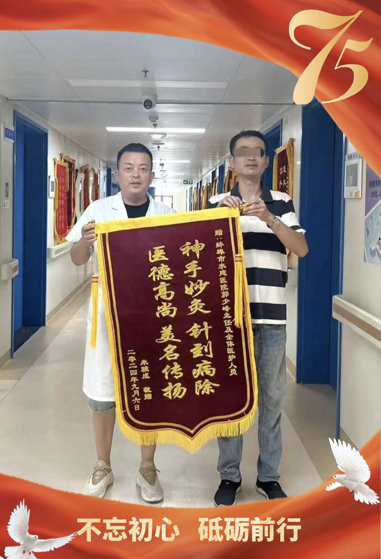 張先生因腰痛嚴(yán)重,無(wú)法直立,日常生活嚴(yán)重受到影響,根據(jù)張先生病情,針推康復(fù)科王主任通過(guò)針灸、正骨推拿、中藥熏蒸、小針刀等綜合康復(fù)治療后,張先生的癥狀明顯改善,隨后,連續(xù)多次康復(fù)治療后,張先生的腰椎可以直立起來(lái),不適癥狀基本消失。張先生對(duì)針推康復(fù)科王永林副主任醫(yī)師的精湛技術(shù)深表佩服,特地贈(zèng)送錦旗表達(dá)感激之情。