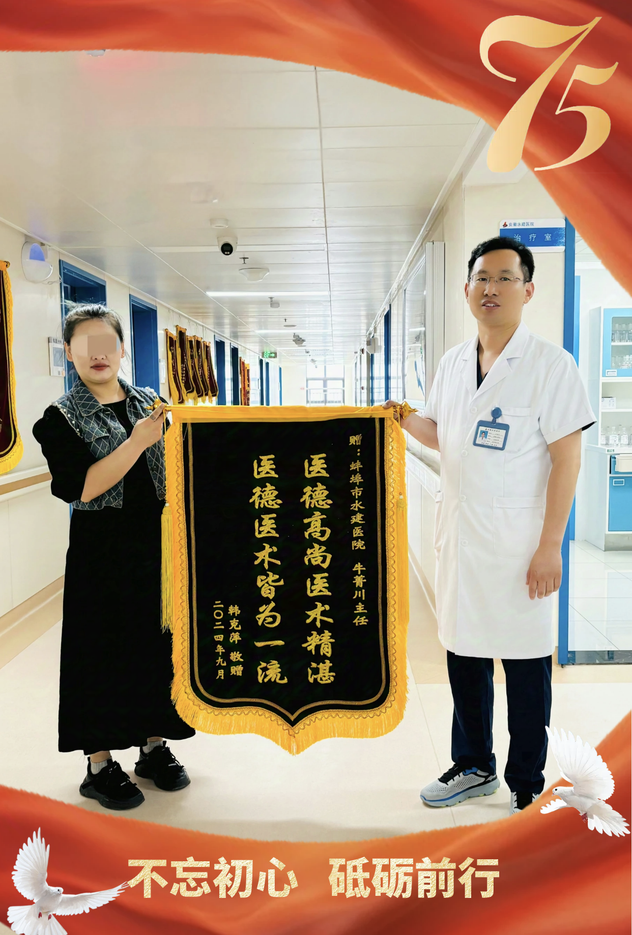 韓女士長(zhǎng)期飽受頸椎病痛的折磨,頸痛伴頭暈、心慌、心煩等癥狀,在外院治療后未見(jiàn)好轉(zhuǎn)。經(jīng)病友介紹我院在治療頸肩腰腿痛疾病方面效果顯著。牛菁川主治醫(yī)師結(jié)合患者癥狀體征及影像學(xué)檢查,給患者采取微創(chuàng)加針刀綜合治療,效果立竿見(jiàn)影,癥狀明顯好轉(zhuǎn)?!拔艺娴奶貏e感謝牛主任,服務(wù)態(tài)度特別好,治療效果也超出了我的預(yù)期?!被颊唔n女士為表達(dá)自己的感激之情,特意為牛菁川主治醫(yī)師送來(lái)一面錦旗。