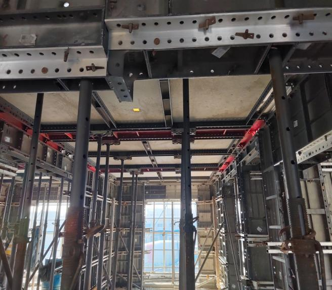 針對住宅樓豎向結(jié)構(gòu)為M型鋼格構(gòu)剪力墻、水平構(gòu)件為疊合板的結(jié)構(gòu)特點(diǎn),項(xiàng)目部經(jīng)過反復(fù)論證,采用非深化鋁模作為主體結(jié)構(gòu)模板,鋁模拆除后,結(jié)構(gòu)面平整,為墻體抹灰提供了良好的基層墻體。同時,對門頭過梁、短門垛、電梯井門頭過梁部分墻體進(jìn)行了簡單優(yōu)化,為砌體施工提供了有利條件。對比傳統(tǒng)木模搭配鋼管內(nèi)支撐,項(xiàng)目通過應(yīng)用非深化鋁模施工技術(shù)節(jié)約成本176.41萬元,減輕了施工現(xiàn)場材料堆放和周轉(zhuǎn)管理難度,提升安全文明施工形象,獲得了建設(shè)單位的認(rèn)可和表揚(yáng)。