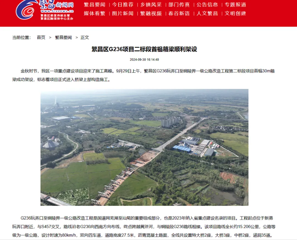 近日,“繁昌新聞網(wǎng)”、“繁昌發(fā)布”視頻號報道由建工建投集團承建的繁昌區(qū)G236項目二標段首榀30m箱梁順利架設(shè)。