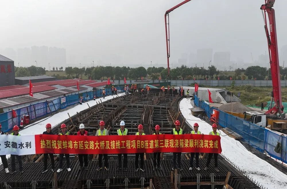 10月16日,歷經(jīng)10個小時的連續(xù)奮戰(zhàn),安徽水利蚌埠市延安路大橋及接線工程首件現(xiàn)澆箱梁順利澆筑,為項目建設(shè)按下加速鍵。