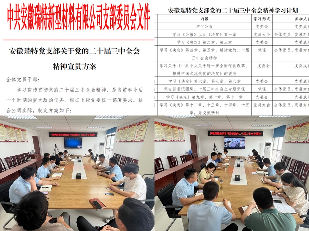 安徽瑞特為深入貫徹落實(shí)黨的二十屆三中全會(huì)精神,進(jìn)一步落實(shí)上級(jí)黨委各項(xiàng)重要決策部署,近日來,黨支部多措并舉,迅速掀起學(xué)習(xí)宣傳貫徹全會(huì)精神的熱潮,準(zhǔn)確把握進(jìn)一步全面深化改革的重大舉措,做到學(xué)深悟透,入腦入心,努力在公司高質(zhì)量發(fā)展新征程上展現(xiàn)新作為。