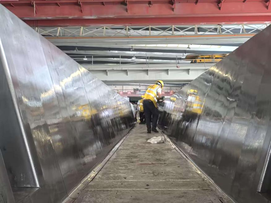以往在箱梁預(yù)制時,鋼模板采用人工手持電動角磨機(jī)及脫模劑手動涂刷作業(yè),存在施工效率低、清理不徹底、涂刷不均勻等直接影響預(yù)制梁體外觀和質(zhì)量的問題。此外,人工打磨周期長、無法與前后工序智能銜接,也制約了梁板流水線生產(chǎn)工業(yè)化建造的發(fā)展。