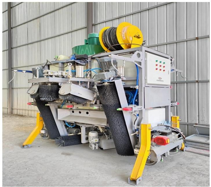 為此,公司創(chuàng)新運(yùn)用了一種能夠適配不同型號箱梁模板的智能打磨機(jī)。該設(shè)備集成自行程、全液壓、全自動、自吸塵、自噴涂于一體,通過傳感器、控制器與專用軟件相結(jié)合,可分析處理數(shù)據(jù)來控制打磨輥的轉(zhuǎn)速、壓力、移動速度等,還能自動控制臂架姿態(tài)。相比傳統(tǒng)人工作業(yè),新型打磨設(shè)備大大提高了效率,減少了人力需求,解決了作業(yè)人員面臨的高溫、粉塵、易滑落致傷等問題。