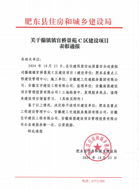 近日,建工交航在建撮鎮(zhèn)鎮(zhèn)官橋景苑拆遷恢復(fù)樓C區(qū)建設(shè)項目喜獲肥東縣住房和城鄉(xiāng)建設(shè)局全縣通報表彰。