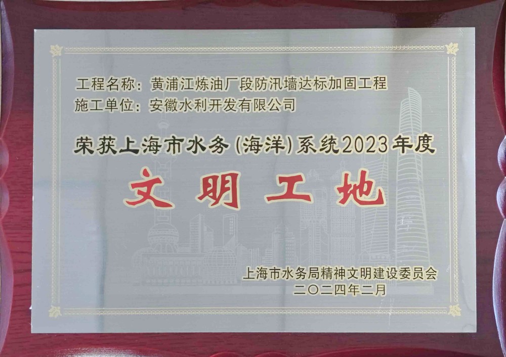 近日,從上海市水務局精神文明建設(shè)委員會傳來喜訊,安徽水利黃浦江煉油廠段防汛墻達標加固工程項目獲“上海市水務(海洋)系統(tǒng) 2023年度文明工地”榮譽稱號。