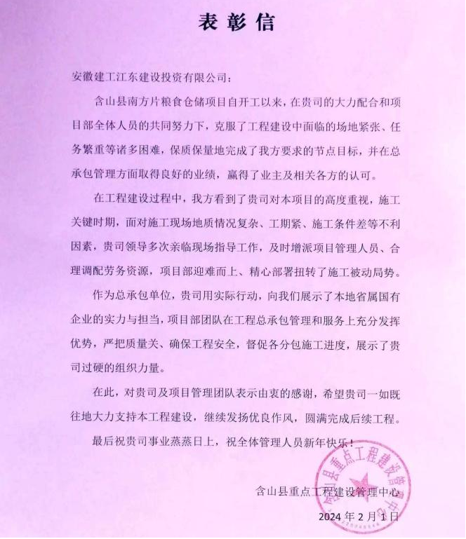 為保障安徽糧儲得好,項目根據(jù)時間節(jié)點倒排工期,動態(tài)調(diào)整施工工序,優(yōu)化改進施工流程,合理安排作業(yè)時間,組成攻堅小組,必要時24小時輪班旁站值守。項目堅持安全第一、預(yù)防為主、綜合治理方針,日常安全教育培訓(xùn)全員覆蓋,針對倉體高空作業(yè)、夜間施工、臨時用電等重點區(qū)域,加強風(fēng)險點和督查整治,時時繃緊“安全弦”。團隊克服工程臨界面交叉點多、變更多等因素影響,高質(zhì)高效推進項目建設(shè),以優(yōu)質(zhì)履約收獲業(yè)主好評,順利通過馬鞍山市建設(shè)工程施工質(zhì)量標(biāo)準(zhǔn)化示范工地驗收。