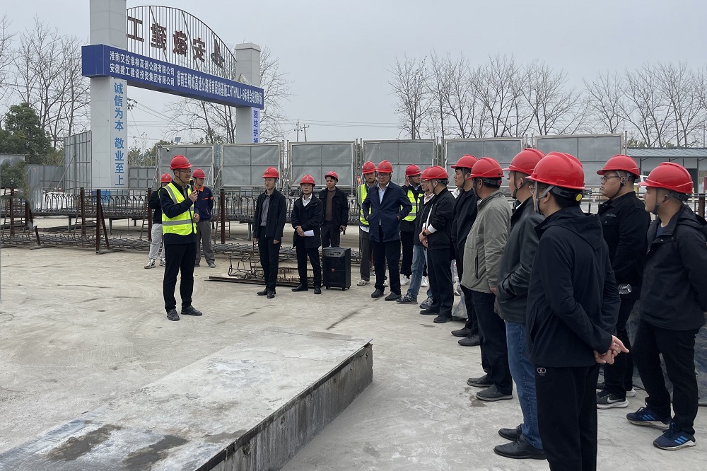 觀摩現(xiàn)場,建工建投集團淮桐高速項目負責人吳華偉介紹了拌合站預制場選址及前期規(guī)劃、場站標準化建設、路基、橋梁施工質量控制措施等方面的情況。