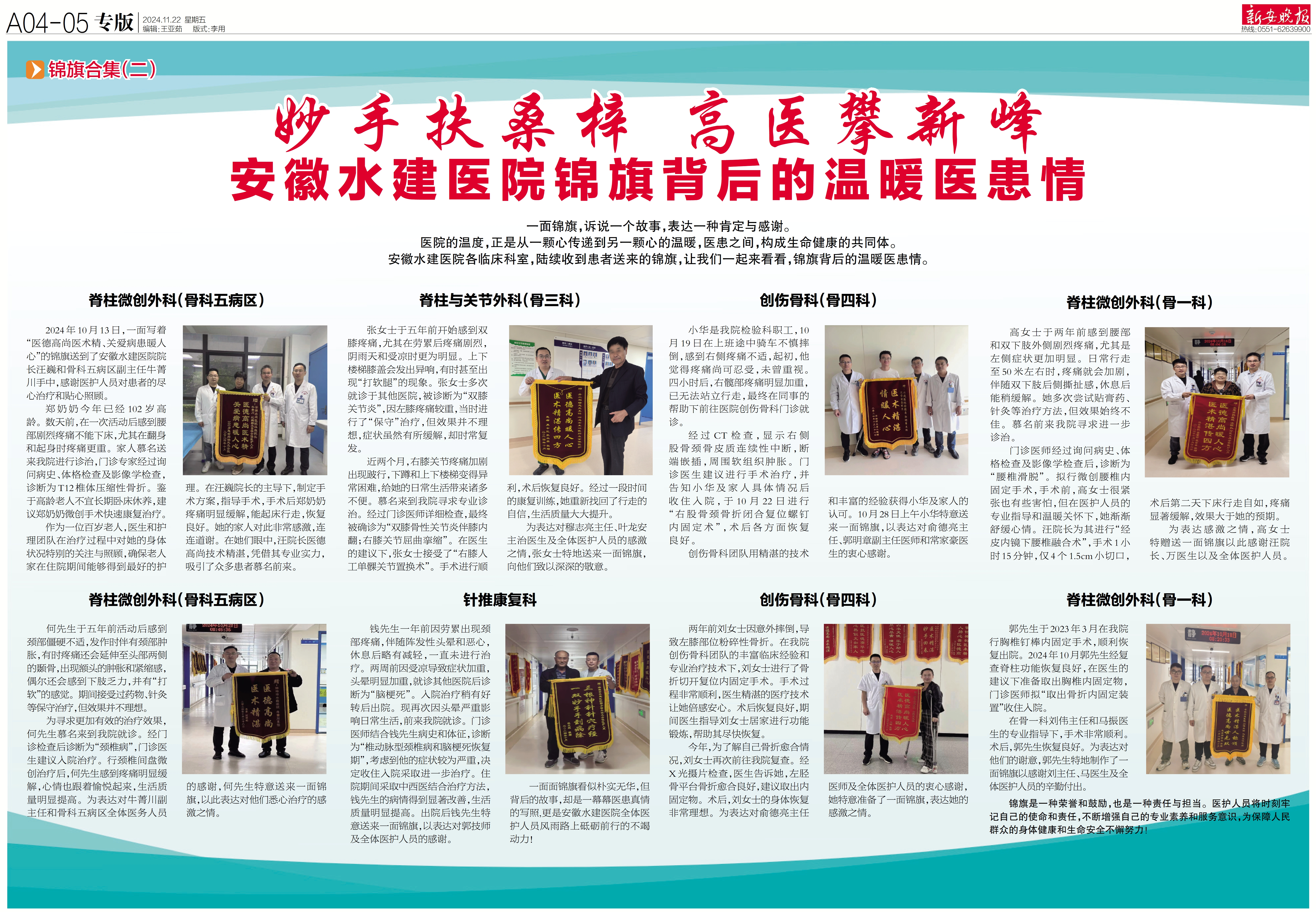 11月22日,新安晚報刊登了水建醫(yī)院《妙手扶桑梓 高醫(yī)攀新峰》專題報道(二),文章圍繞今年10月份以來,醫(yī)院各科室收到錦旗背后的溫暖醫(yī)患情進行了深情講述。