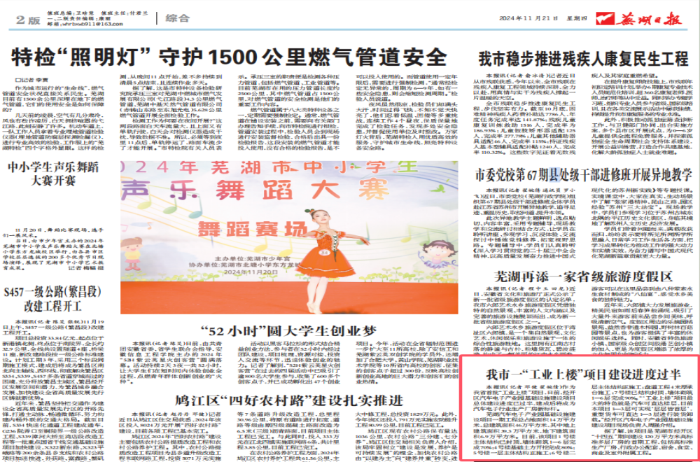 11月21日,蕪湖日報(bào)以《我市一“工業(yè)上樓“項(xiàng)目建設(shè)進(jìn)度過半》為題,對安徽建工蕪湖經(jīng)開區(qū)汽車電子產(chǎn)業(yè)園項(xiàng)目建設(shè)進(jìn)展進(jìn)行關(guān)注報(bào)道。