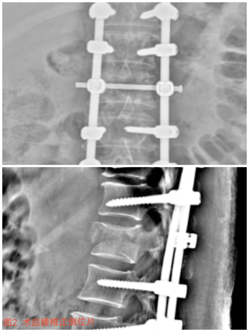 俞德亮副主任醫(yī)師深知病情的嚴(yán)重性,拖得時(shí)間越久,脊髓神經(jīng)損傷癥狀越難以恢復(fù),必須把握住早期減壓手術(shù)的關(guān)鍵時(shí)間窗,緊急帶領(lǐng)創(chuàng)傷骨科醫(yī)師團(tuán)隊(duì)對(duì)該病情進(jìn)行討論、制定手術(shù)方案,并成功為患者急診行“L1椎體爆裂性骨折伴截癱切開椎板切除+椎管探查減壓+骨折復(fù)位釘棒系統(tǒng)內(nèi)固定術(shù)(圖2)”,該手術(shù)精確解除對(duì)脊髓神經(jīng)的壓迫,并通過椎弓根螺釘內(nèi)固定系統(tǒng)對(duì)受損的腰椎提供穩(wěn)固的支撐,為后期的康復(fù)創(chuàng)造了良好的條件。