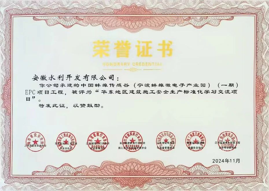 11月28日,從華東地區(qū)建筑安全聯(lián)誼會傳來喜訊,安徽水利承建的中國蚌埠傳感谷(寧波蚌埠微電子產(chǎn)業(yè)園)EPC項(xiàng)目、蚌埠液力機(jī)械有限公司擴(kuò)建及智能制造基地建設(shè)項(xiàng)目獲評“華東地區(qū)建筑施工安全生產(chǎn)標(biāo)準(zhǔn)化學(xué)習(xí)交流項(xiàng)目”,這是繼2023年兩個項(xiàng)目獲得“華東地區(qū)施工安全生產(chǎn)標(biāo)準(zhǔn)化工地”榮譽(yù)后再一次獲得此榮譽(yù)。