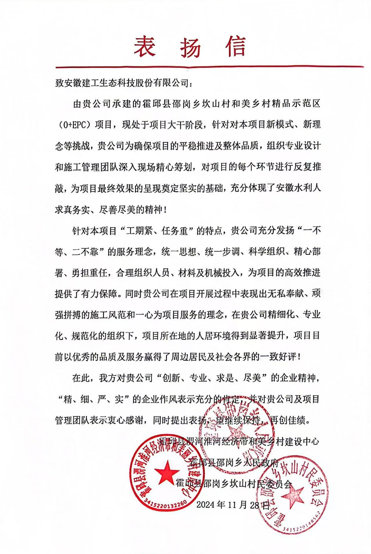 11月28日,安徽水利霍邱縣邵崗鄉(xiāng)坎山村和美鄉(xiāng)村精品示范村(O+EPC)項目獲霍邱縣邵崗鄉(xiāng)人民政府等多家單位來信表揚。