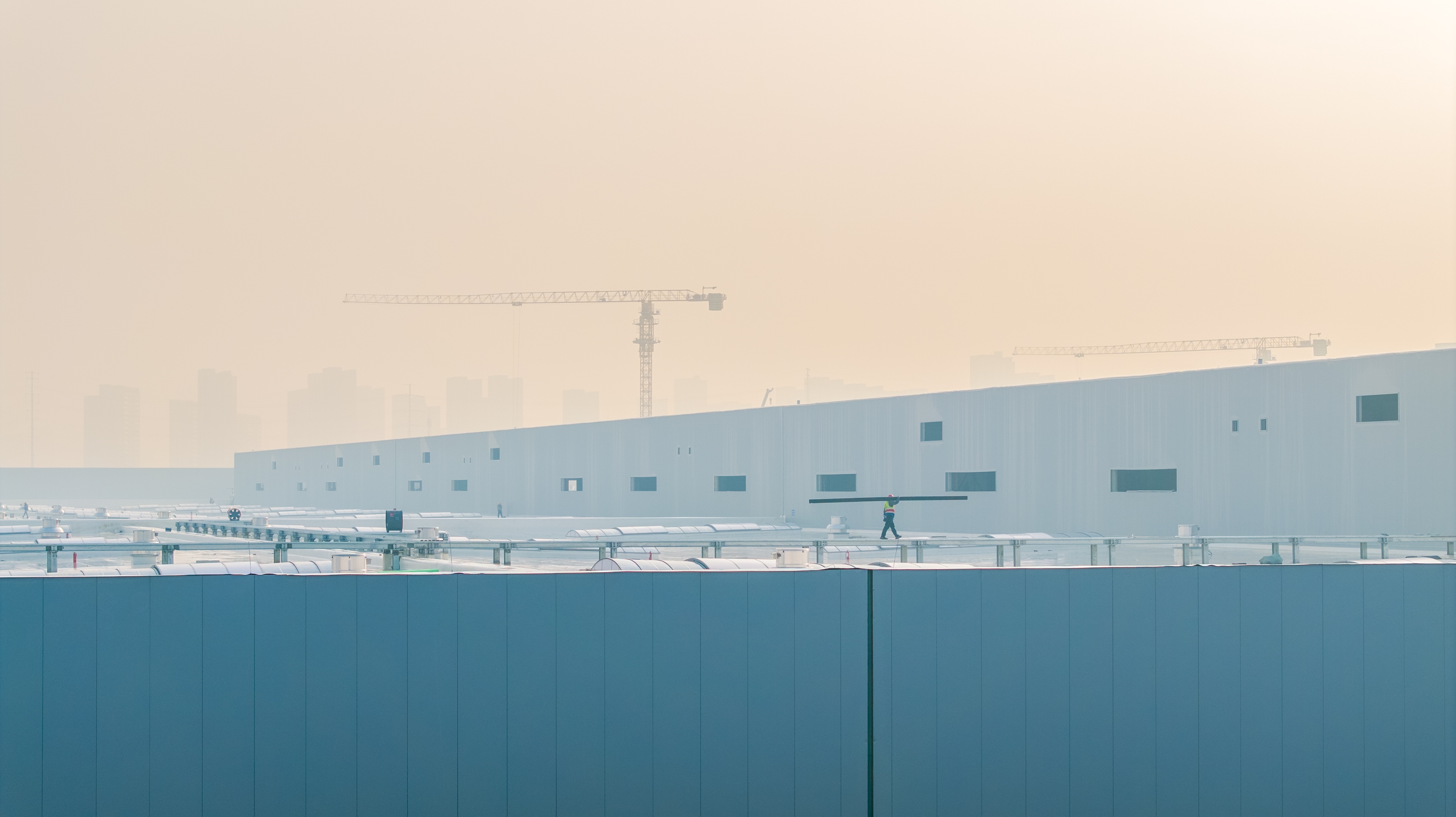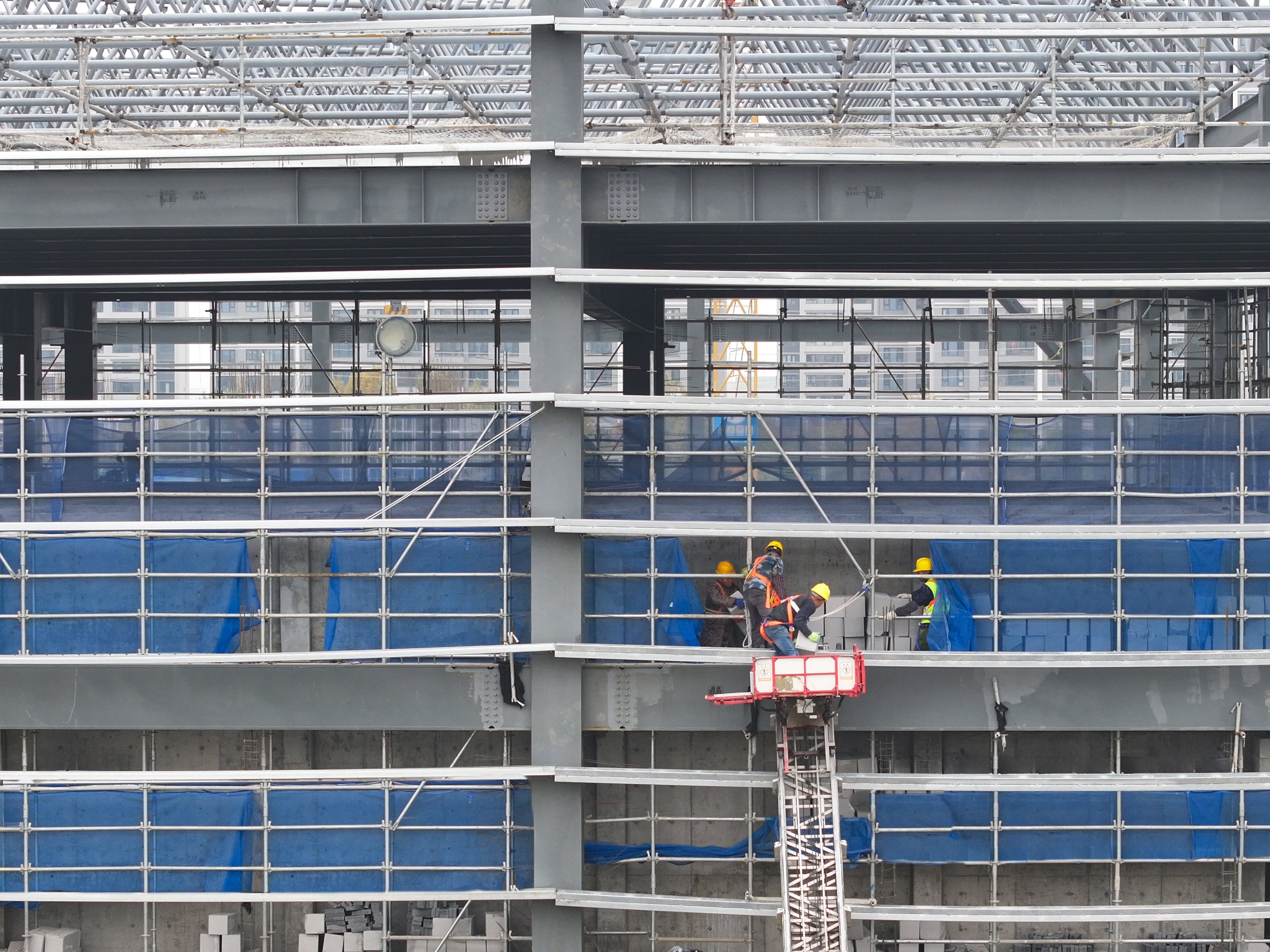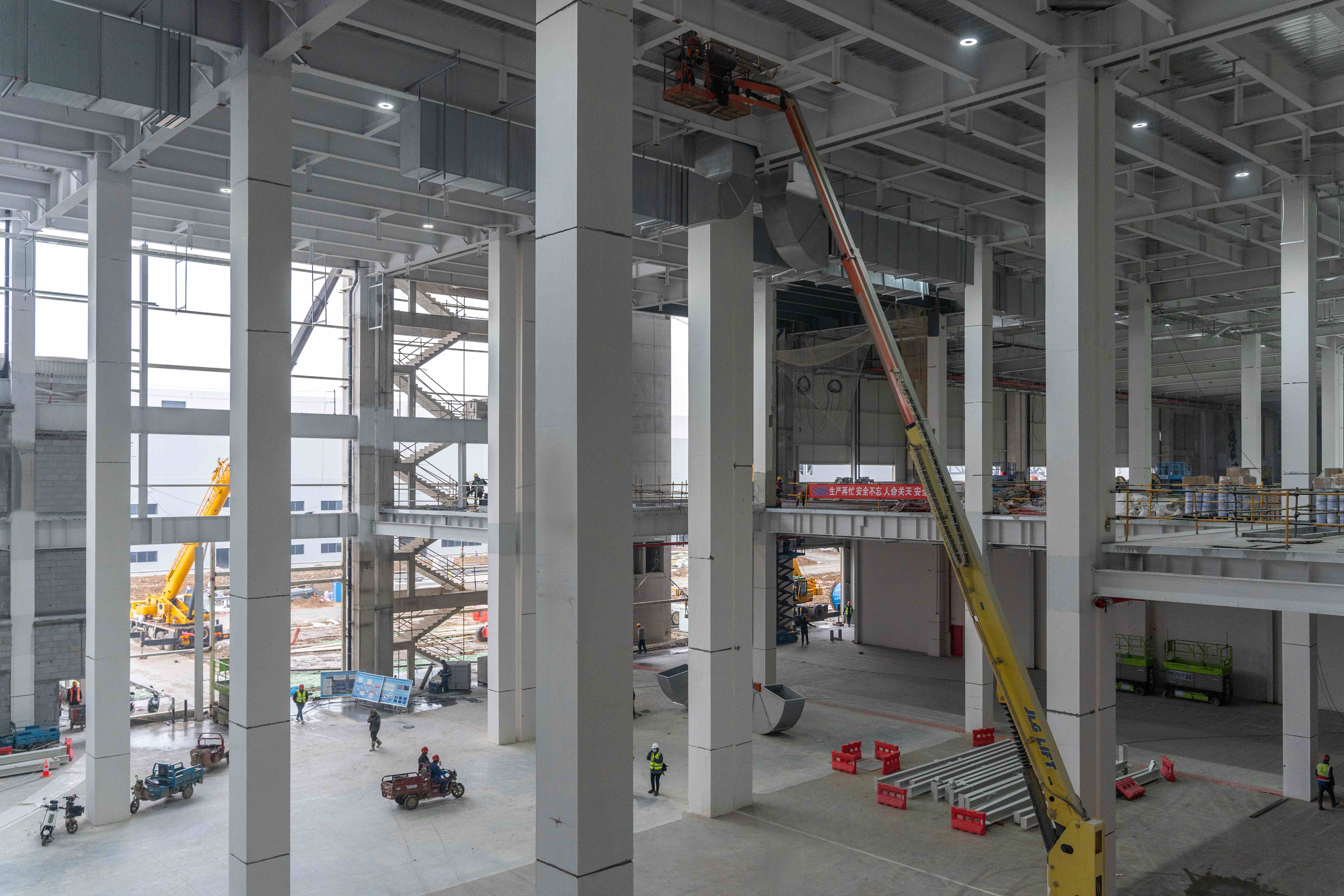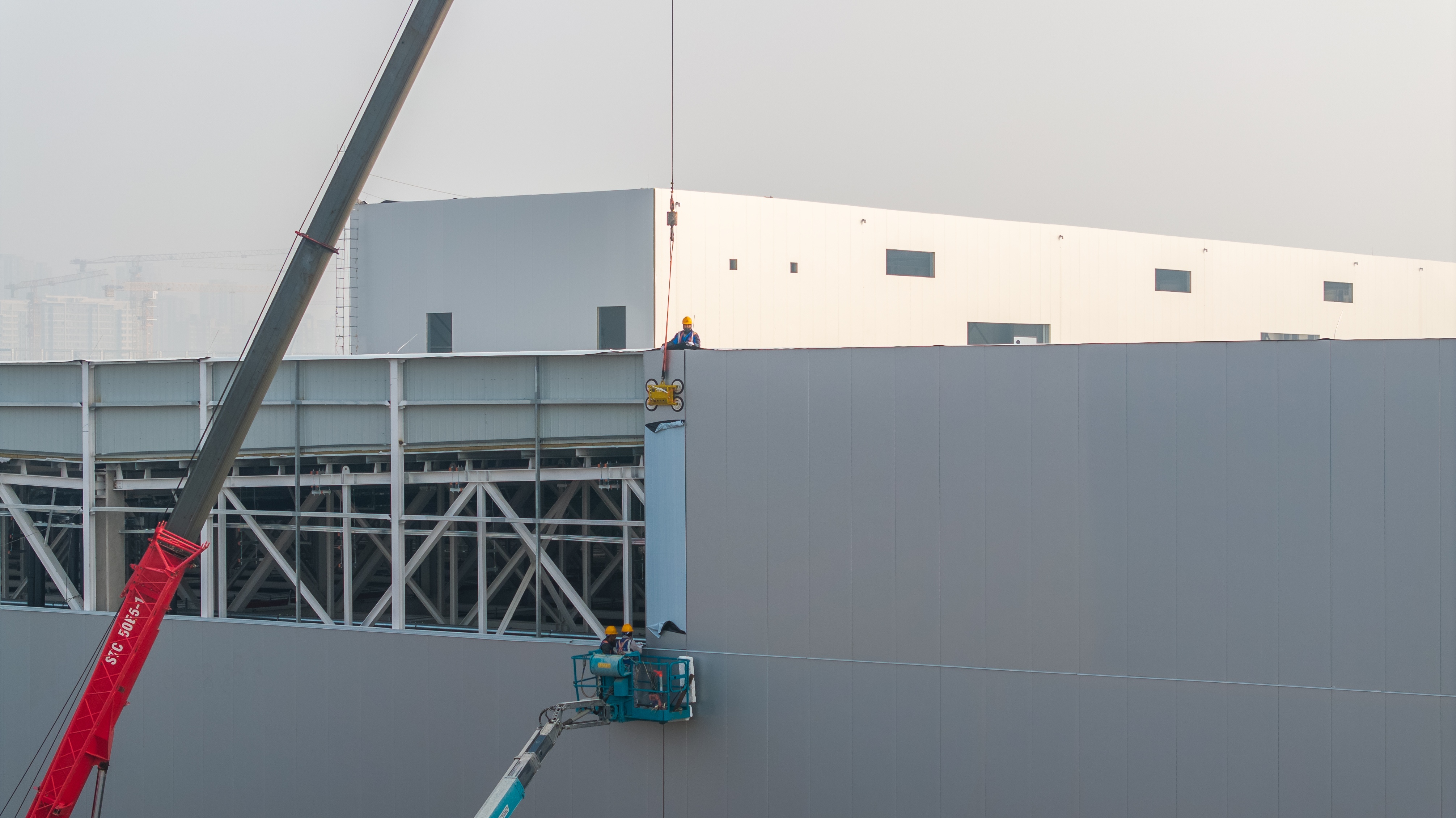 車間三:二次結(jié)構(gòu)、油漆施工、墻體砌筑、地坪固化、ALC墻體、硅酸鹽板、防火涂料噴涂、鋼結(jié)構(gòu)外墻板施工安裝進(jìn)行中;