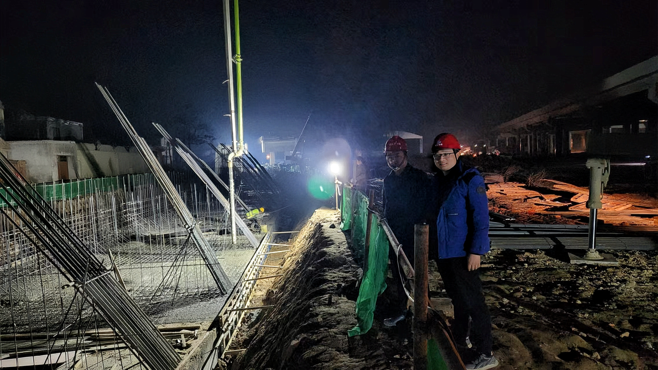 夜晚,星光照耀、接力前行。當夜幕降臨,施工現(xiàn)場并未沉寂,混凝土輸送泵車、吊車等施工機械在轟鳴聲中運轉(zhuǎn),不同崗位的工人各司其職,全力推進各項施工面的高效建設(shè)。