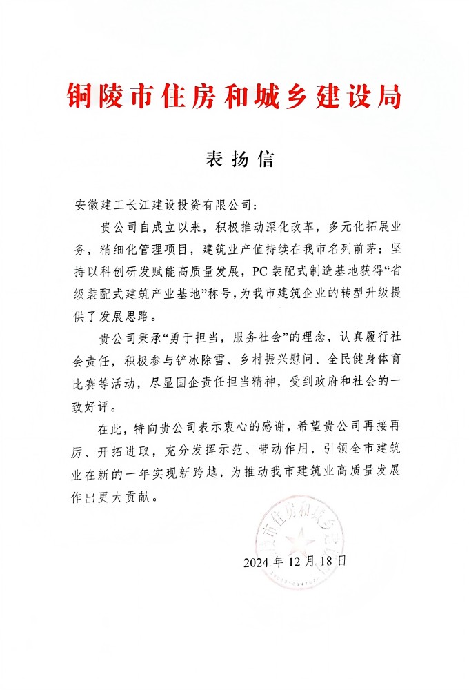 日前,銅陵市住房和城鄉(xiāng)建設局發(fā)來表揚信,對安徽建工長江建投在履行社會責任,秉承國企擔當方面表示感謝,并給予表揚。