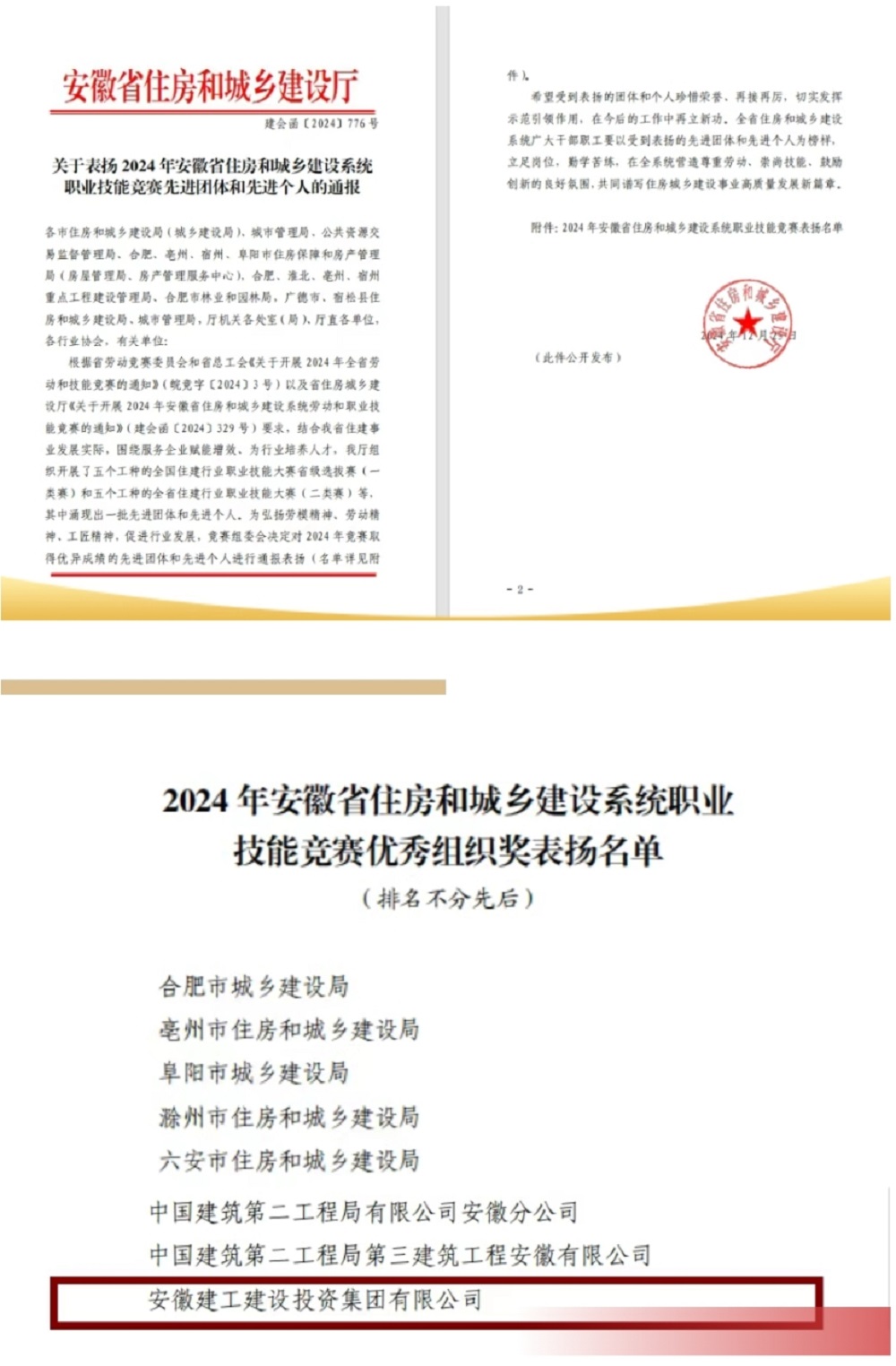 近日,安徽省住房和城鄉(xiāng)建設(shè)廳發(fā)布《關(guān)于表揚(yáng)2024年安徽省住房和城鄉(xiāng)建設(shè)系統(tǒng)職業(yè)技能競(jìng)賽先進(jìn)團(tuán)體和先進(jìn)個(gè)人的通報(bào)》,對(duì)2024年競(jìng)賽取得優(yōu)異成績的先進(jìn)團(tuán)體和先進(jìn)個(gè)人進(jìn)行通報(bào)表揚(yáng)。其中,建工建投集團(tuán)喜獲優(yōu)秀組織獎(jiǎng)!另4名員工喜獲先進(jìn)個(gè)人表揚(yáng)。